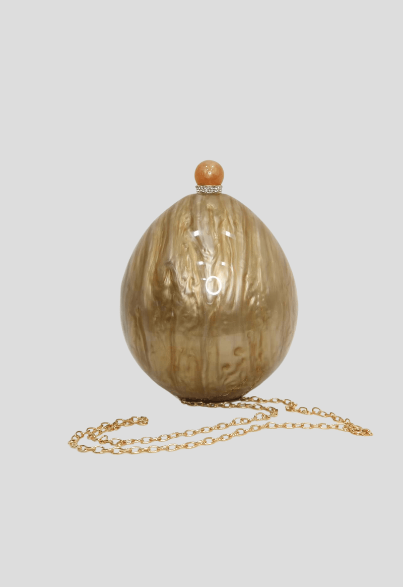 Clutch em formato único, oval. Em material de estilo madrepérola. Acompanha alça removível.
