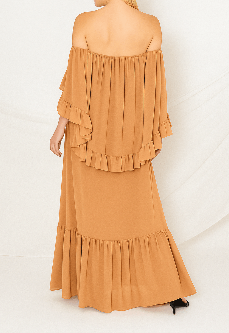 Vestido longo, fluído, ombro a ombro com sobreposição de tecido nas costas, trazendo elegância e fluidez. Babados nas mangas e saia.