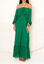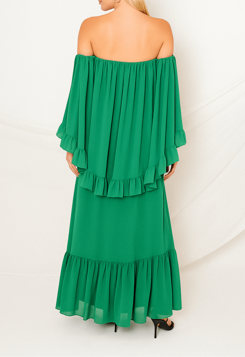 Vestido longo, fluído, ombro a ombro com sobreposição de tecido nas costas, trazendo elegância e fluidez. Babados nas mangas e saia.