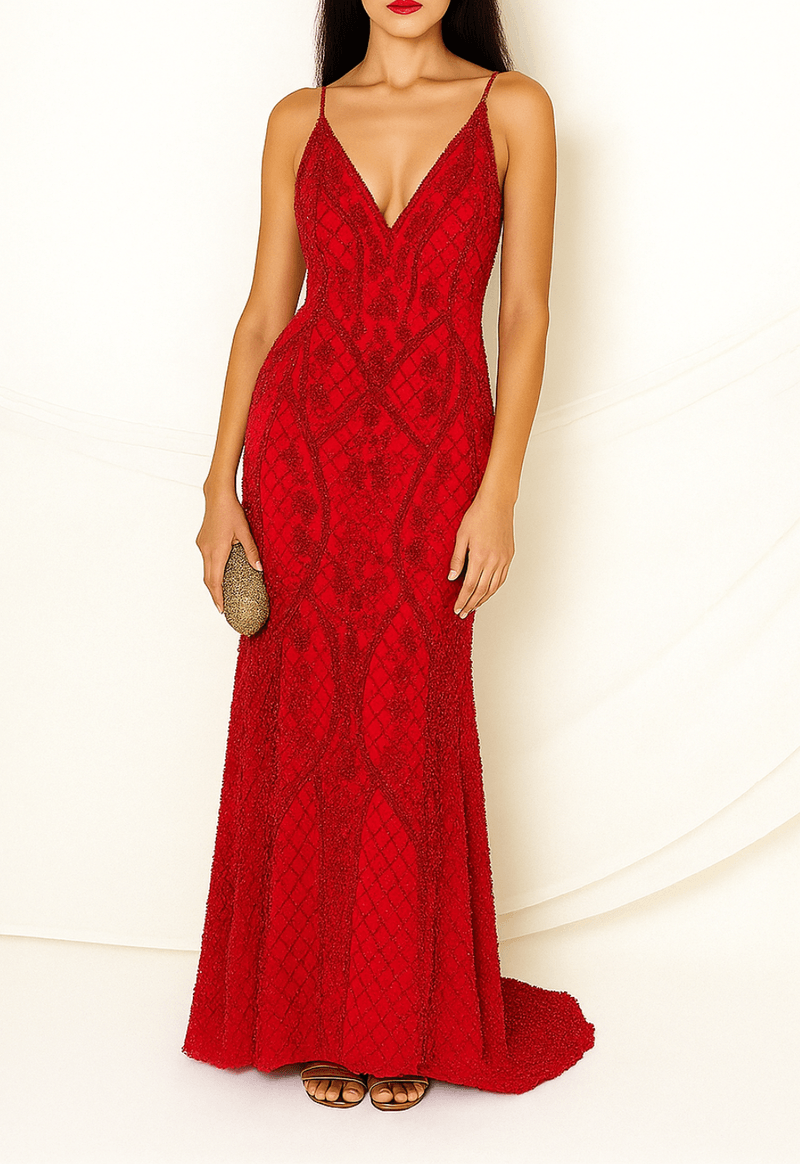 Vestido longo sem alças com pedrarias por todo seu comprimento e recortes transparentes nas laterais.