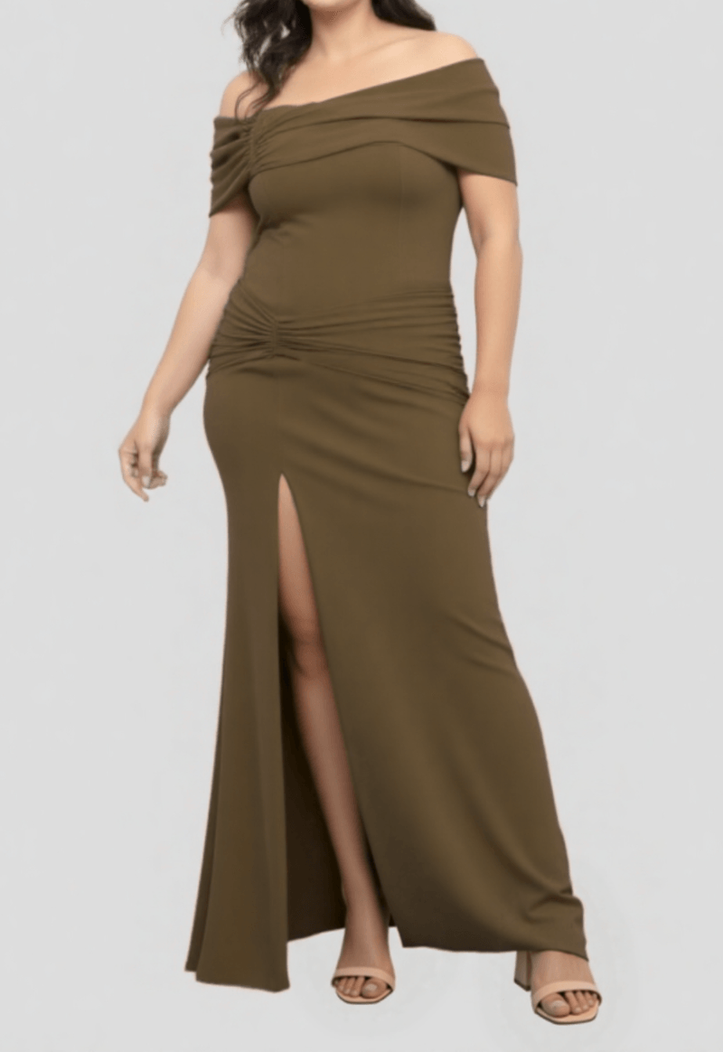 Vestido longo, ombro a ombro com fenda lateral e drapeado no quadril.