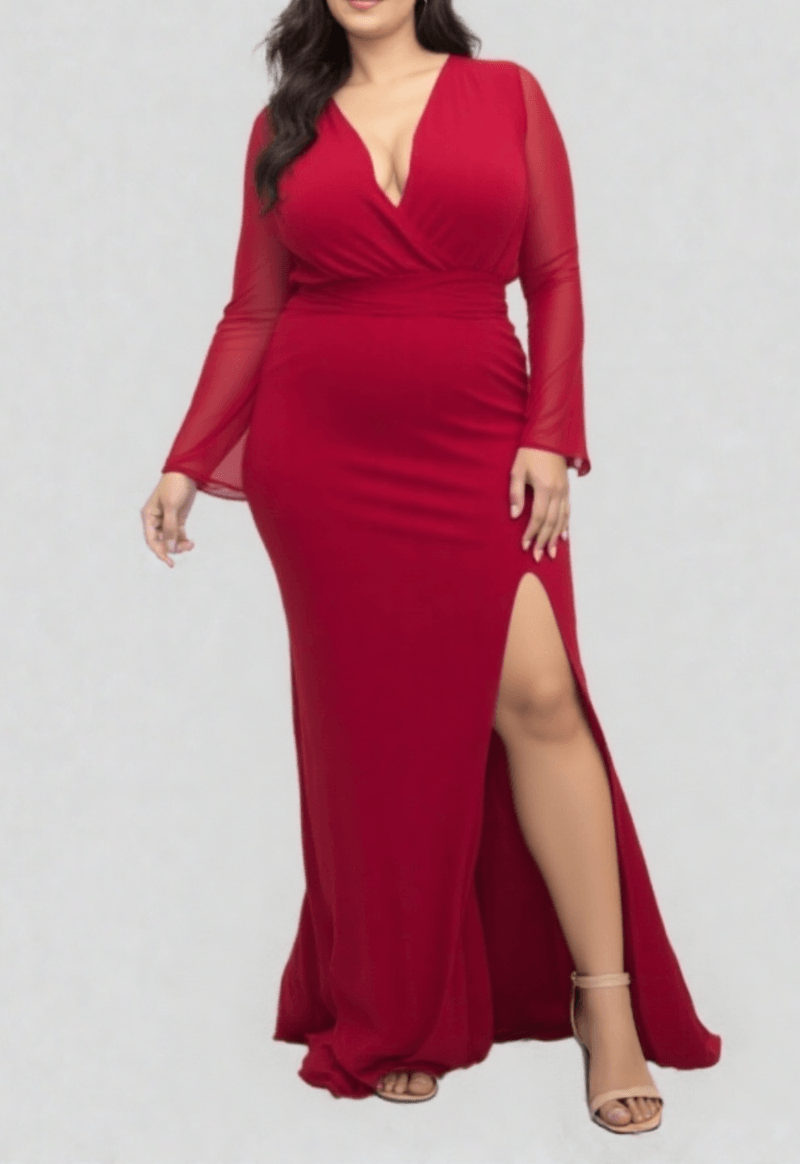 Vestido longo em tecido fluido com manga longa. Detalhe de fenda frontal e decote transpassado. Possui faixa para amarração e zíper invisível nas costas. Ideal para festas e eventos à noite.