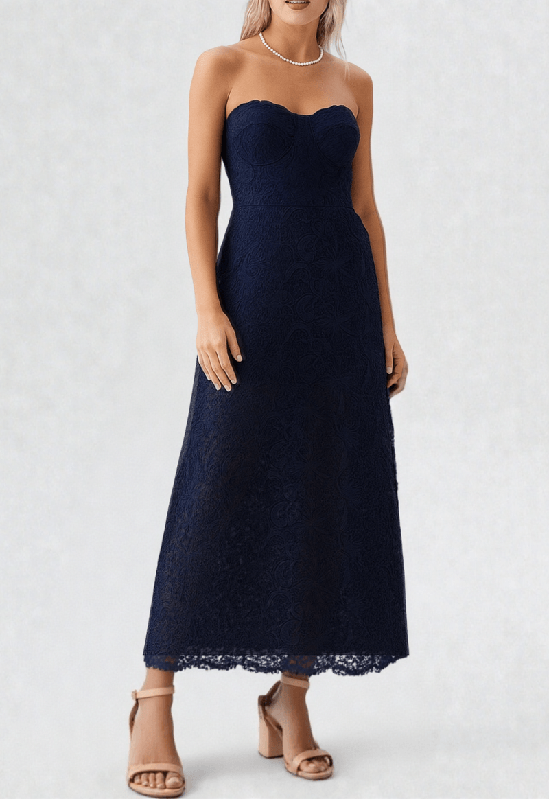 Vestido midi, modelo tomara que caia e comprimento rendado.