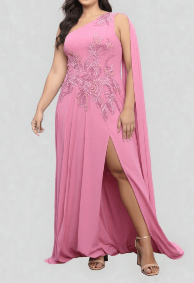 Vestido longo acinturado, alongando a silhueta. Possui uma capa no ombro esquerdo, que, junto à fenda lateral na saia, dá movimento ao vestido. Pedrarias na cintura.